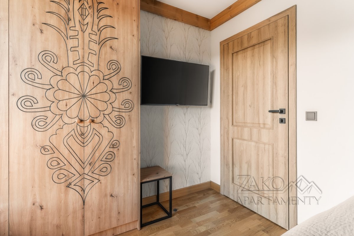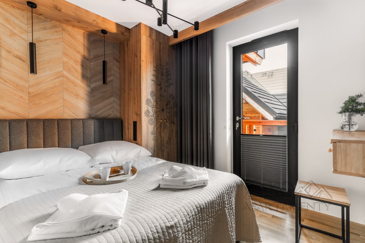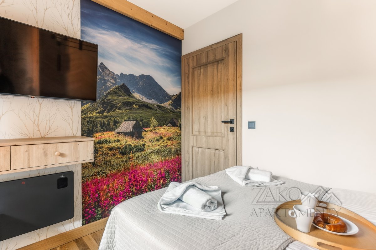 | Sypialnia 2 | Łoże małżeńskie (140cm/200cm) szafa, TV, pościel, wyjscie na balkon z widokiem na Giewont |