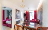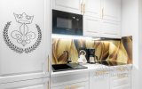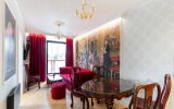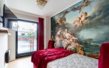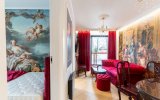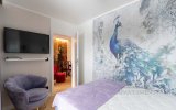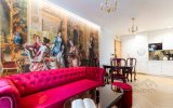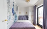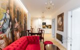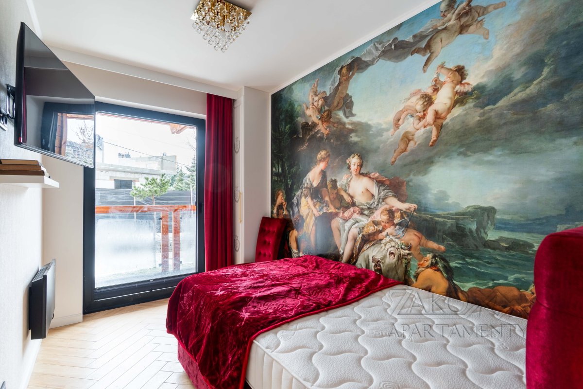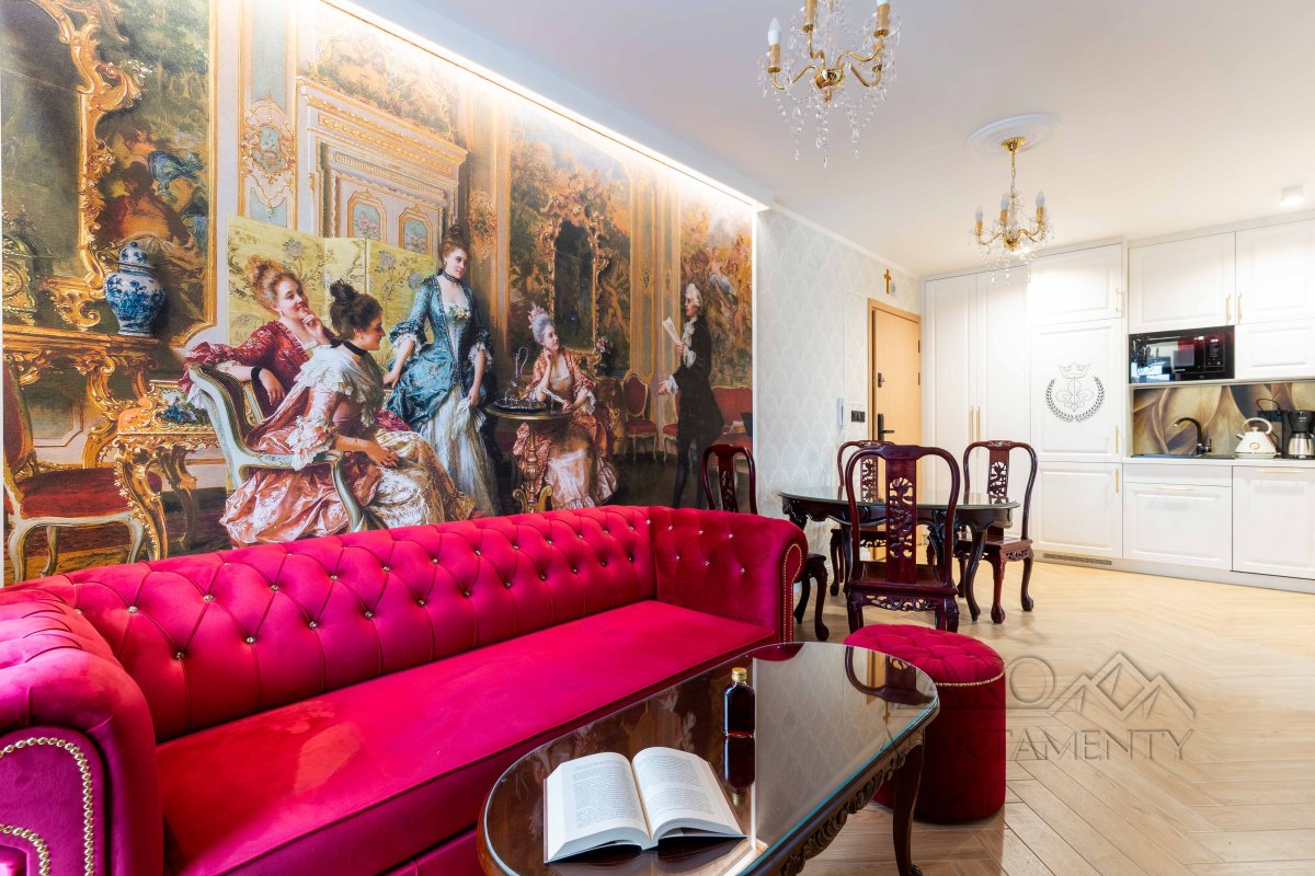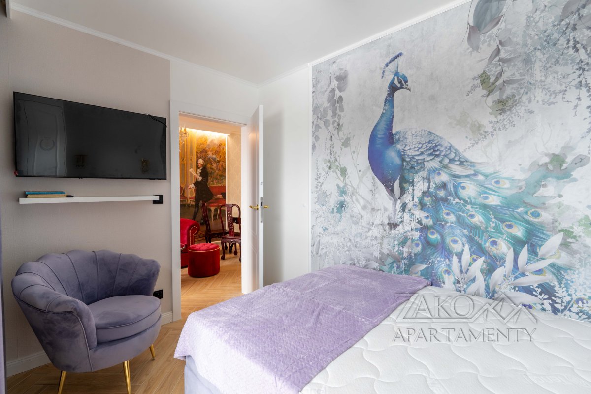 Wystrój apartamentu oparty jest na zabytkowych meblach w stylu glamour, które tworzą spójną, elegancką całość z ręcznie wykonaną kanapą oraz efektownymi kryształowymi żyrandolami i kinkietami. Wnętrze wzbogacają artystyczne fototapety – w salonie reprodukcja obrazu „Panie podziwiają czytanie poezji” oraz fototapeta z okładką książki właściciela apartamentu.W głównej sypialni znajduje się fototapeta inspirowana dziełem Francoisa Bouchera (1703–1770) „Porwanie Europy”, natomiast druga sypialnia zachwyca klimatyczną fototapetą z motywem imponującego pawia na tle liści drzew.