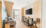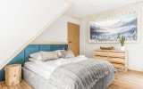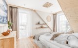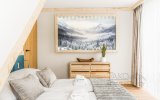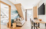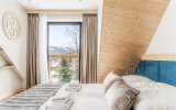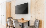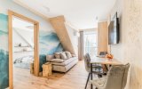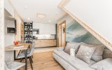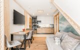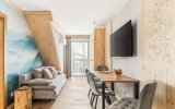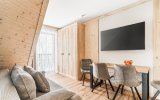 To komfortowy, 4-osobowy apartament urządzony w stylu nowoczesnym góralskim - z eleganckimi elementami drewna i przytulnymi akcentami inspirowanymi naturą. W przestronnym salonie uwagę przyciąga wyjątkowa tapeta przedstawiająca las i delikatnie zamglone góry - tworzy ona nastrojowe tło do porannej kawy i wieczornego relaksu. Sypialnia jest jasna i przytulna, a jej charakter podkreśla piękny, podświetlany obraz z motywem górskiego lasu. Z sypialni można wyjść bezpośrednio na balkon - idealne miejsce, by złapać oddech i nacieszyć się ciszą.