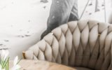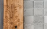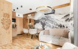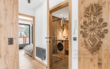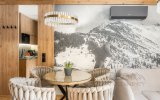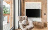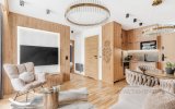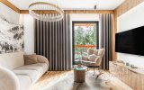Wnętrze apartamentu zachwyca stylem inspirowanym Podhalem. Dominuje tu naturalne drewno, które nadaje przestrzeni ciepła i autentycznego, górskiego klimatu. Rzeźbione parzenice oraz subtelne regionalne akcenty podkreślają lokalny charakter aranżacji. Salon zdobi stylowa, czarno-biała fototapeta przedstawiająca górski krajobraz oraz postać Kuriera Tatrzańskiego, która nadaje wnętrzu wyjątkowej tożsamości i nawiązuje do historii regionu. Całość tworzy harmonijną, stylową, ciepłą i przytulną przestrzeń sprzyjającą wypoczynkowi.