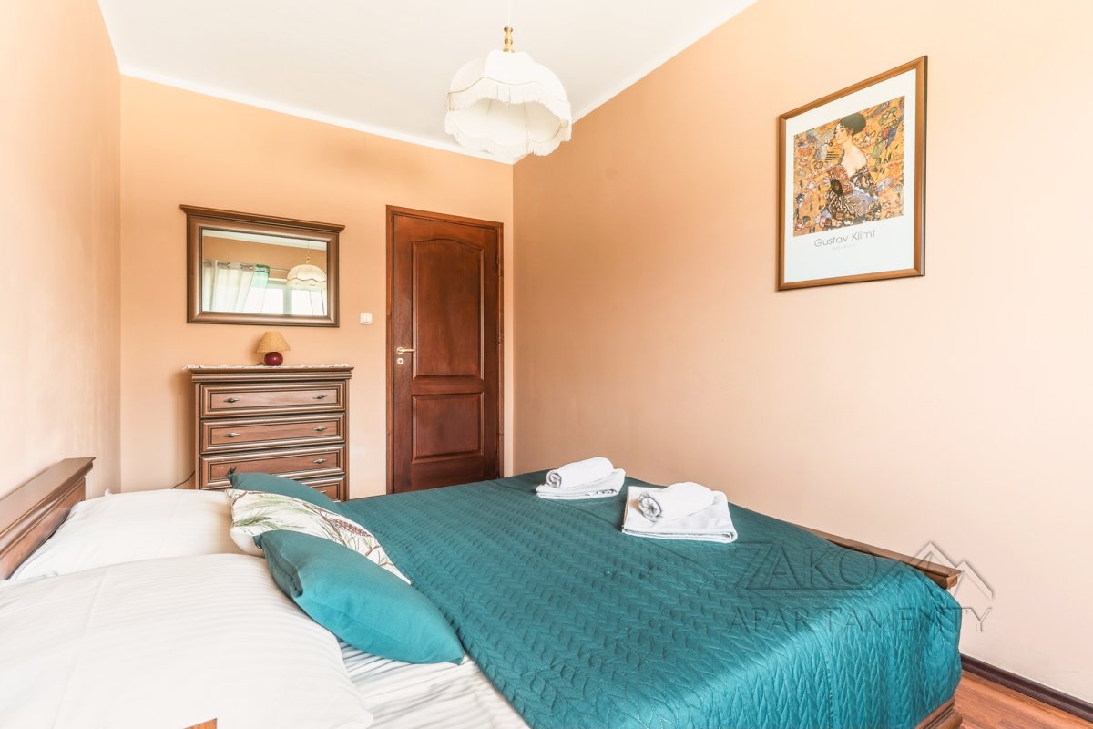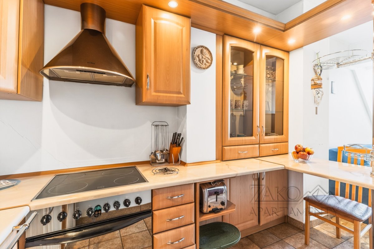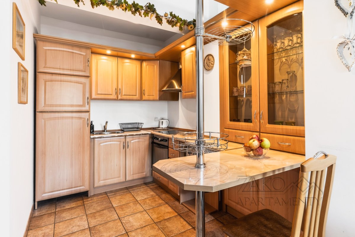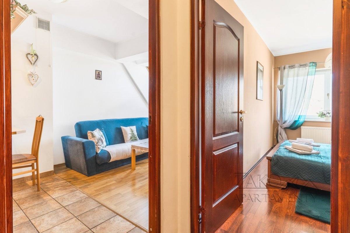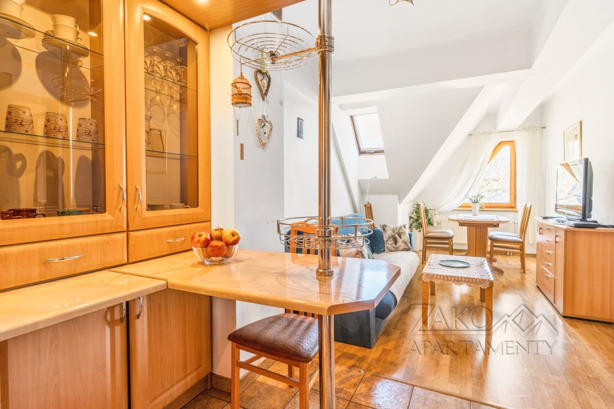 Funkcjonalne wnętrze zostało wykończone w tradycyjnym, klasycznym stylu. Domową atmosferę tworzą stylowe drewniane meble, które nadają przestrzeni wyjątkowego charakteru. Układ apartamentu obejmuje sypialnię, łazienkę oraz przytulny salon z aneksem kuchennym i dużym rodzinnym stołem.