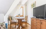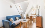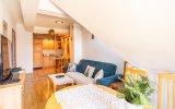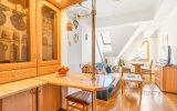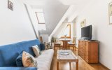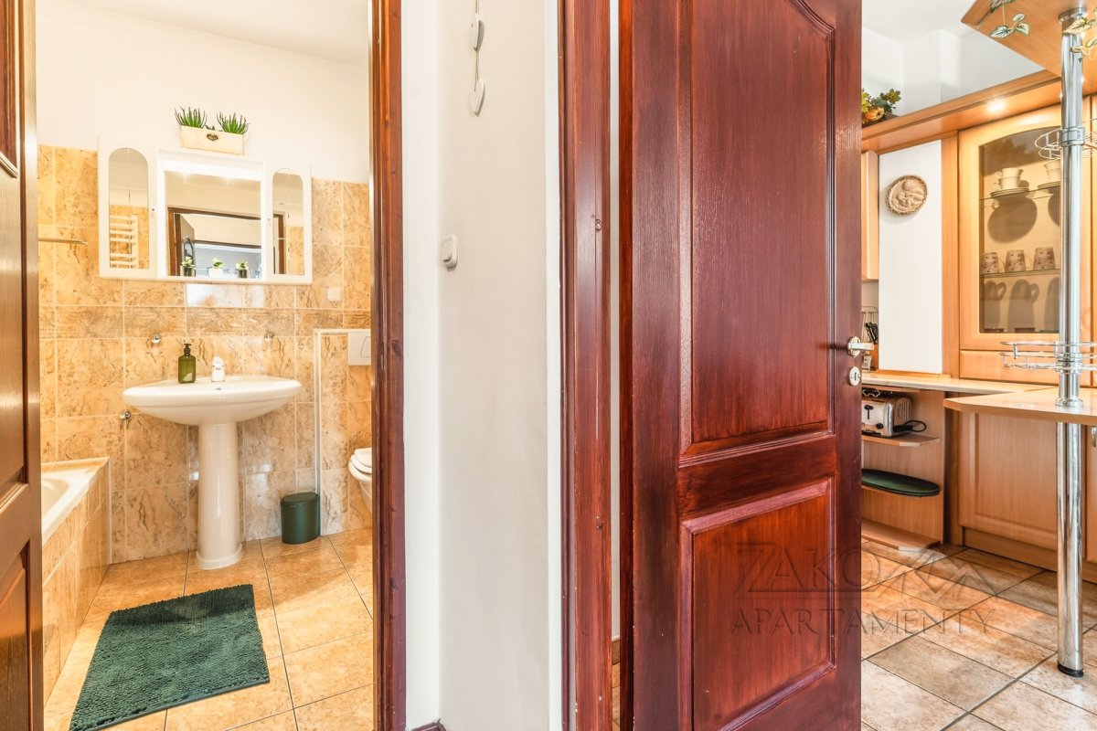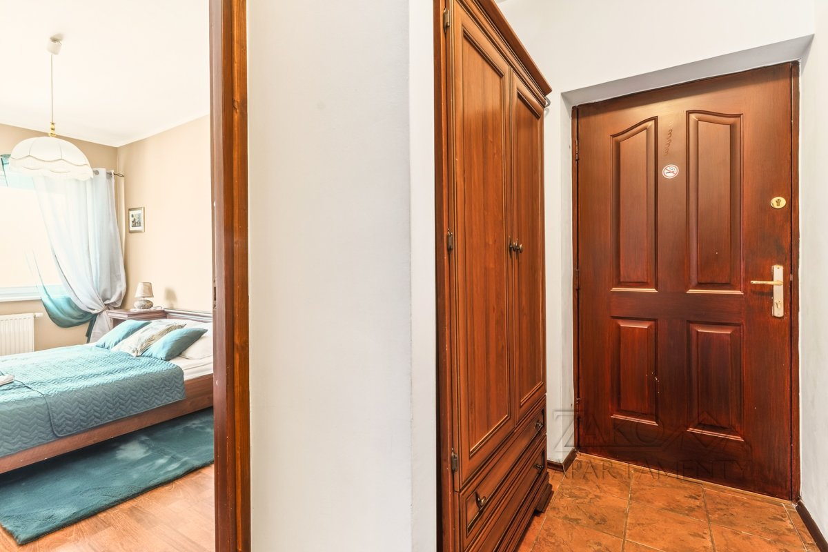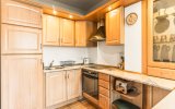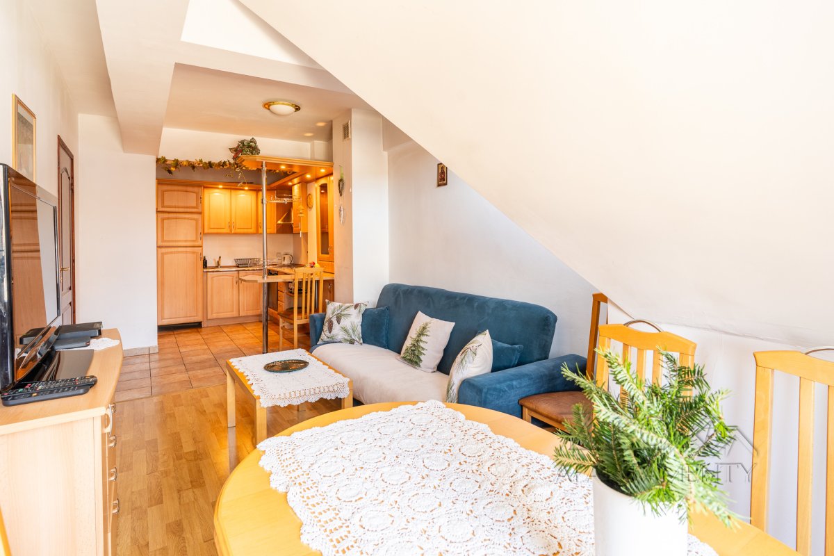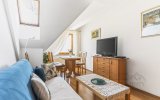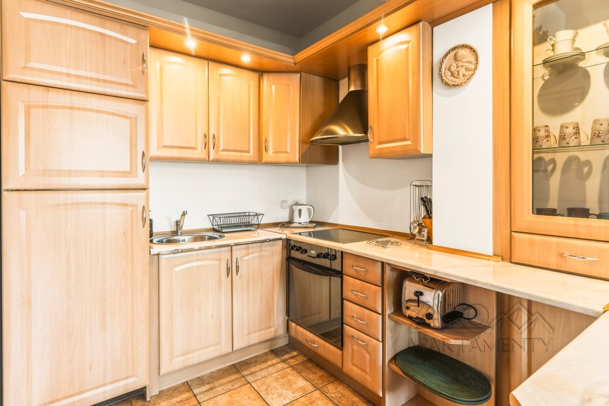 Funkcjonalne wnętrze zostało wykończone w tradycyjnym, klasycznym stylu. Domową atmosferę tworzą stylowe drewniane meble, które nadają przestrzeni wyjątkowego charakteru. Układ apartamentu obejmuje sypialnię, łazienkę oraz przytulny salon z aneksem kuchennym i dużym rodzinnym stołem.