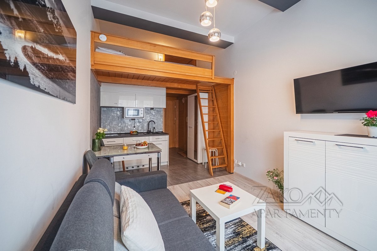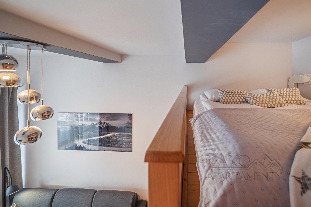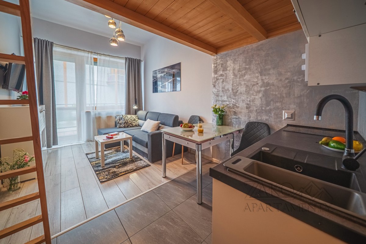 | Struktura | salon z aneksem kuchennym, antresola, łazienka, przedpokój, balkon z widokiem na Giewont |