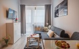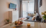 | Salon | 1 x sofa narożna rozkładana do spania dla dwóch osób (140cm/200cm),tv, stolik kawowy, stół + krzesła, wyjście na balkon. |