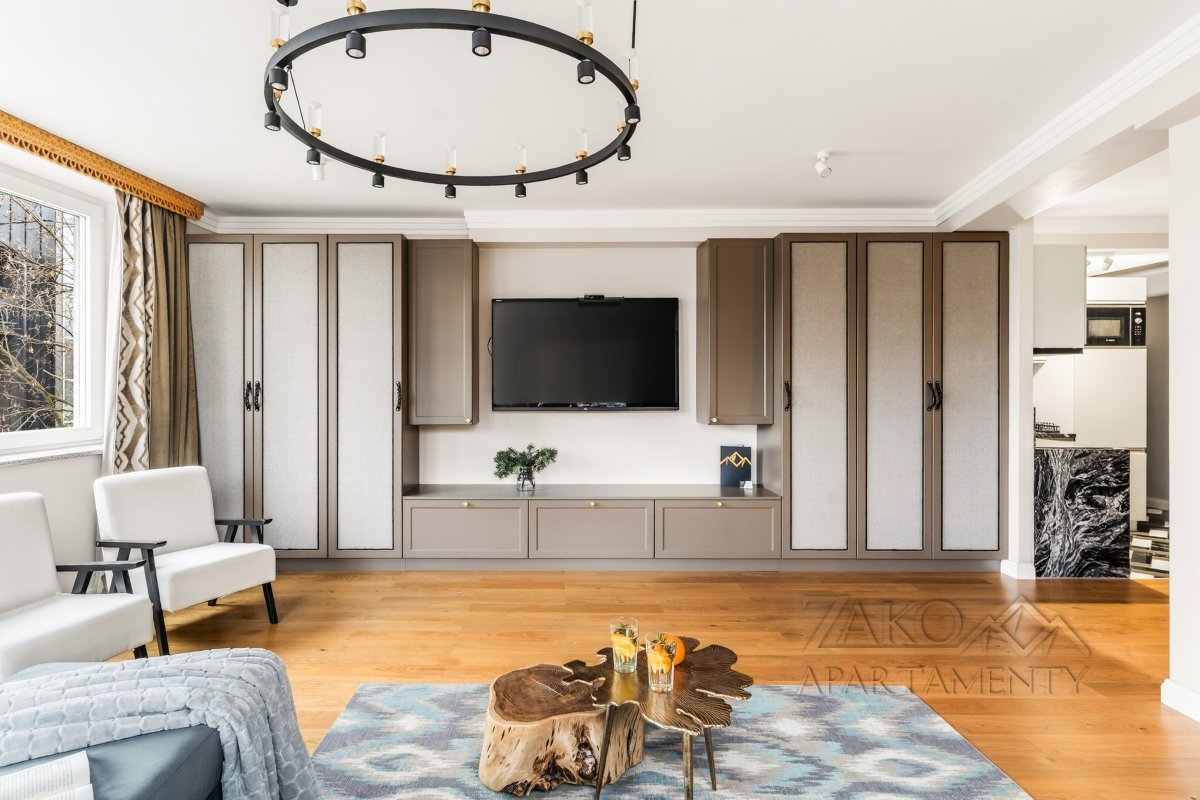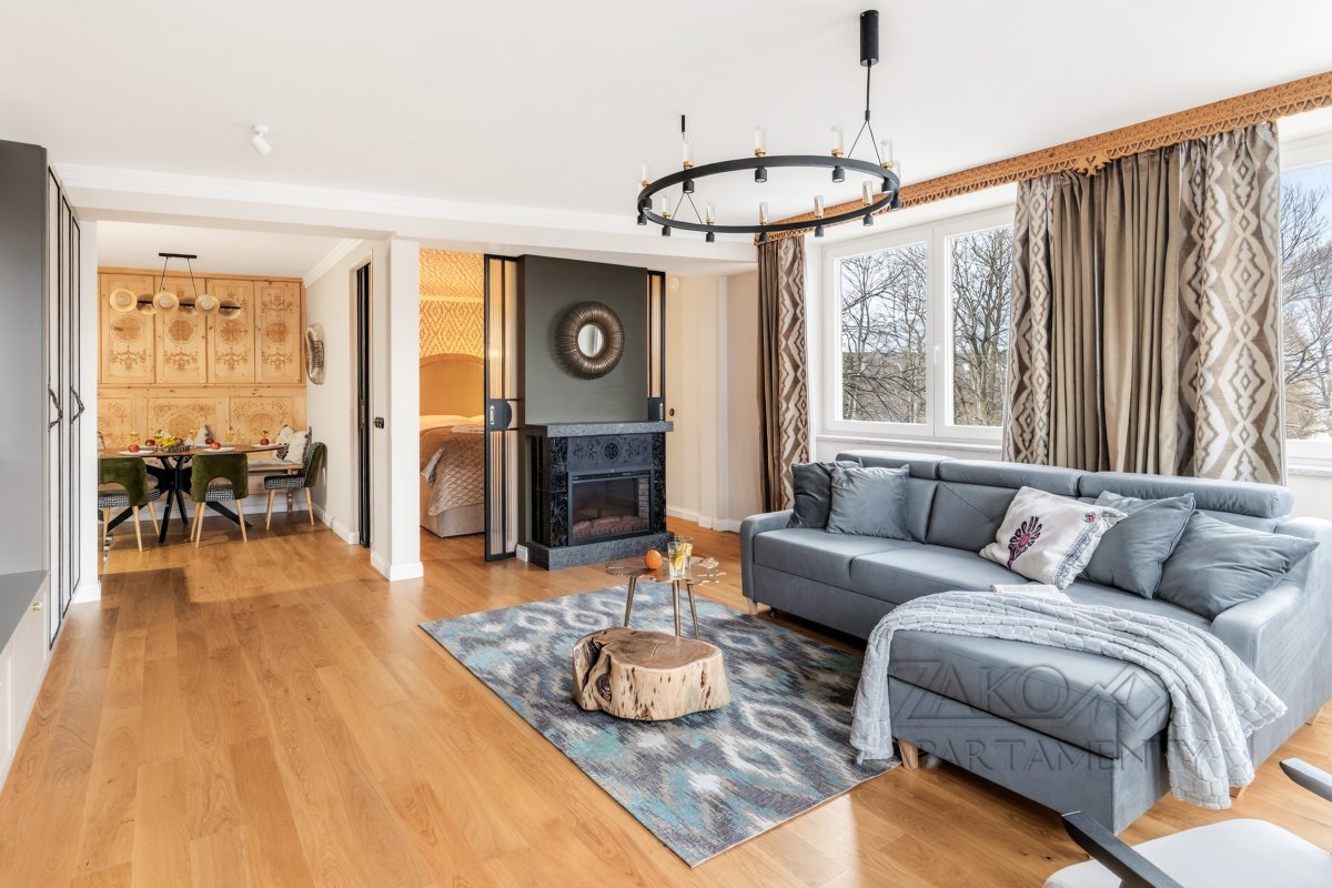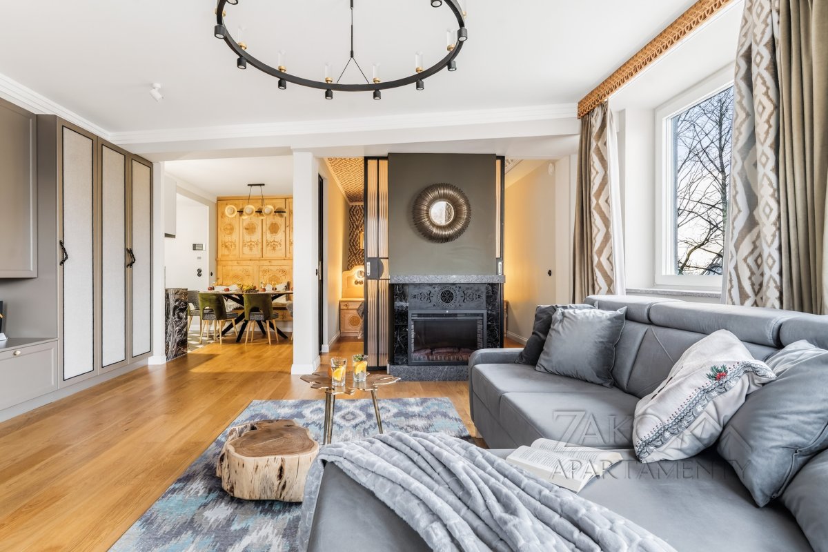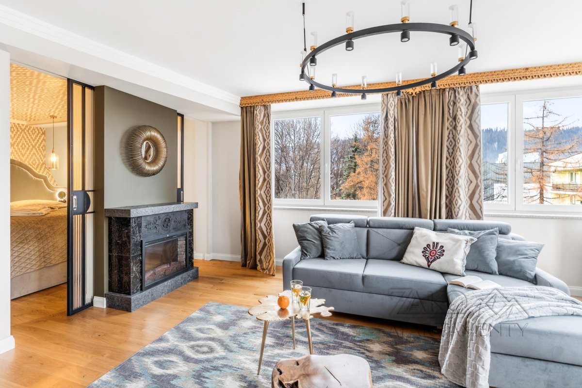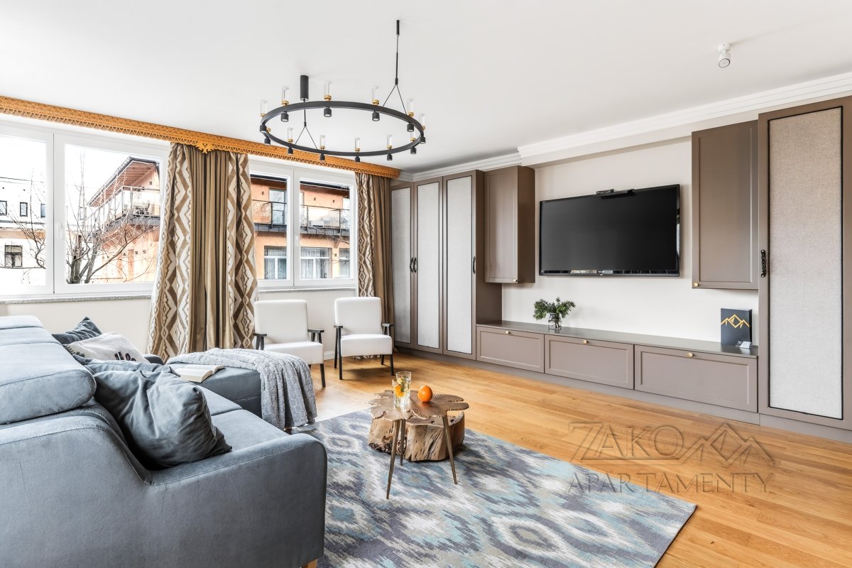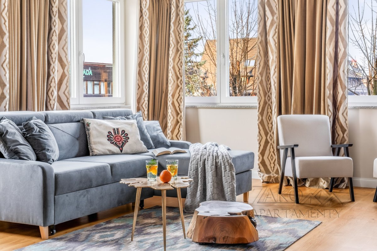 Apartament charakteryzuje się dużymi przeszkleniami, które doskonale doświetlają wnętrza i pozwalają cieszyć się widokiem na górskie otoczenie. Bliskość Tatr oraz wyjątkowa atmosfera Zakopanego sprzyjają relaksowi i niezapomnianym wrażeniom przez cały rok.