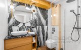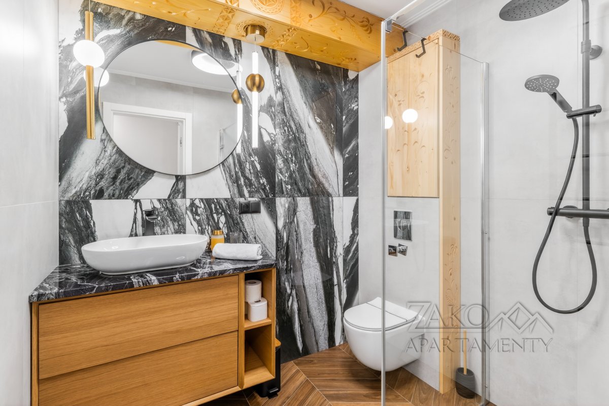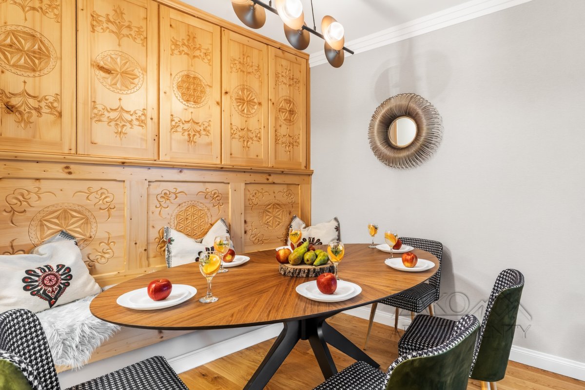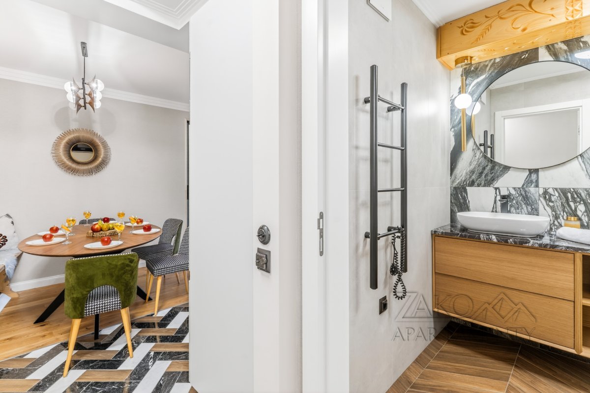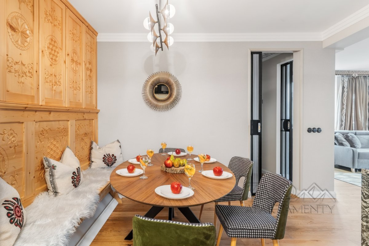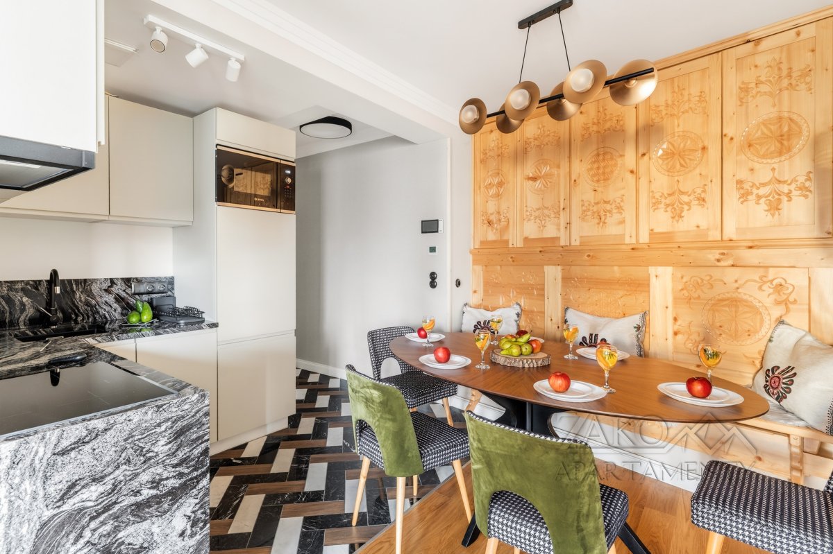 Apartament charakteryzuje się dużymi przeszkleniami, które doskonale doświetlają wnętrza i pozwalają cieszyć się widokiem na górskie otoczenie. Bliskość Tatr oraz wyjątkowa atmosfera Zakopanego sprzyjają relaksowi i niezapomnianym wrażeniom przez cały rok.
