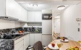 Kuchnia Płyta elektryczna, czajnik elektryczny, lodówka, zmywarka, kuchenka mikrofalowa, garnki, naczynia, sztućce, szkło