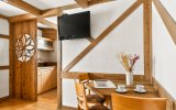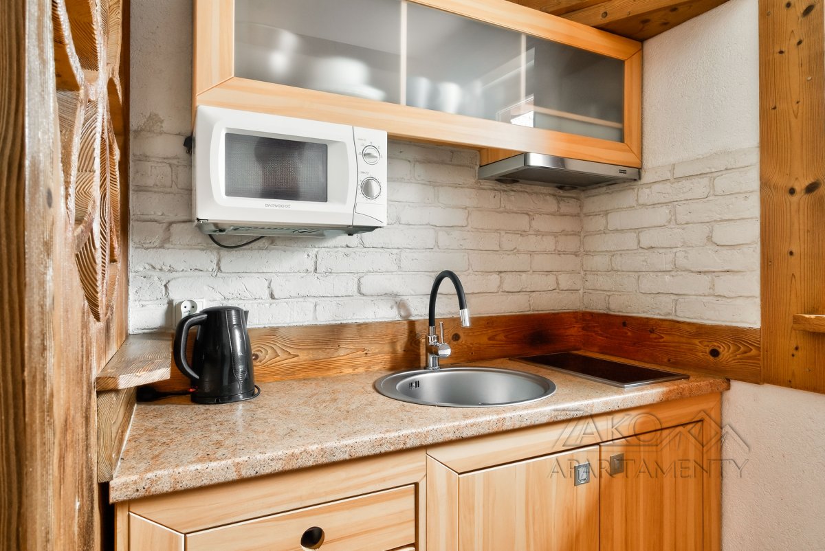 | Kuchnia | kuchenka elektryczna 2 palnikowa, lodowka, czajnik elektryczny, mikrofalówka, garnki, patelnia, naczynia, szkło, sztućce |