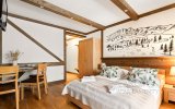 | Salon | 1x podwójne łoże małżeńskie 160cm x 200cm, 2x szafka nocna, stół, 3x krzesło, TV-lcd, szafa, wyjście na balkon. |