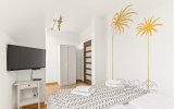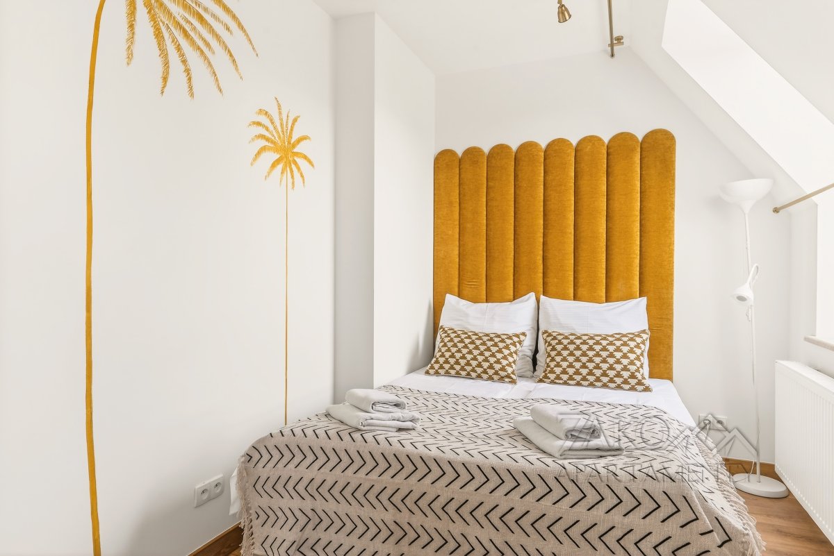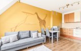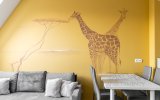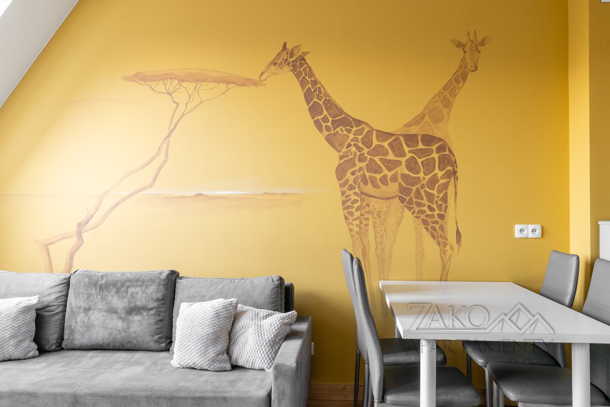 Apartament Safari to ciepłe, stylowe wnętrze, które przenosi Gości w egzotyczny klimat Afryki. W salonie uwagę przyciąga artystyczny rysunek przedstawiający żyrafy oraz subtelne motywy safari, a eleganckie złote i drewniane dodatki, dopełniają atmosferę wnętrza. Przytulny salon sprzyja wspólnym chwilom, a komfortowa sypialnia zapewni relaks po dniu spędzonym na górskich szlakach.