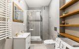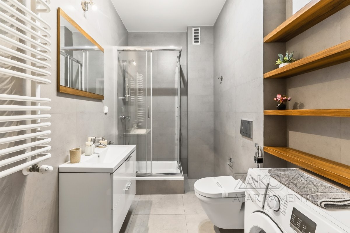 Łazienka prysznic, umywalka, wc, pralka, ręczniki, suszarka do włosów