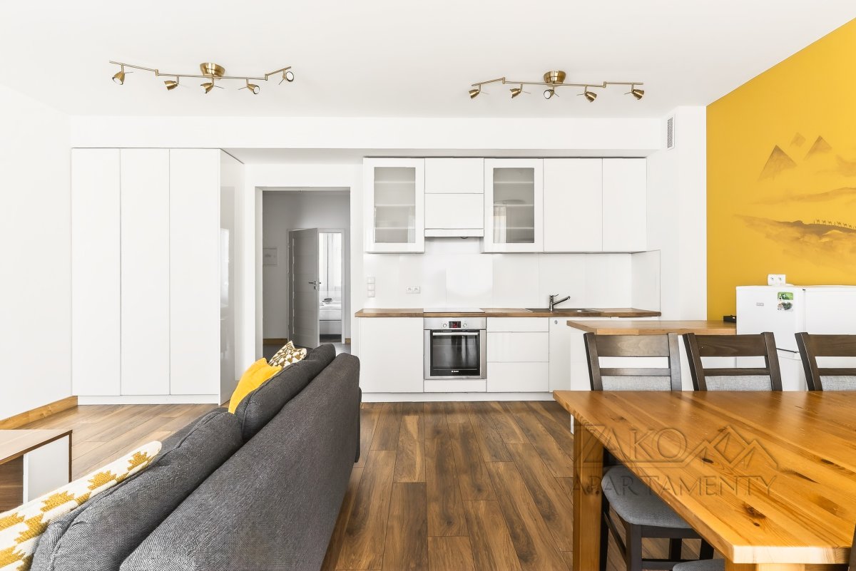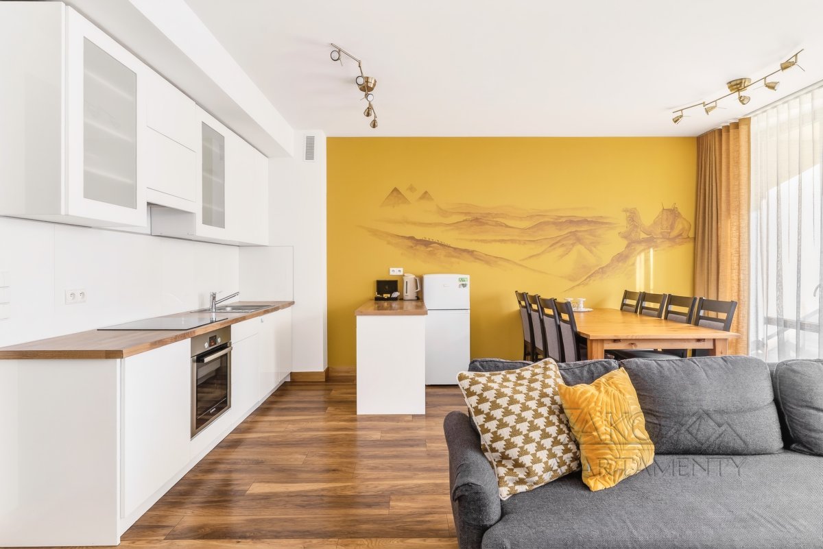 W nowocześnie zaprojektowanym a równocześnie idealnie wpasowującym się w górski krajobraz apartamentowcu znajduje się APARTAMENT KAIR, który jest wymarzonym miejscem do spędzenia urlopu dla osób, którym zależy na bliskości gór  i miejskich atrakcji jednocześnie. Goście apartamentu w zasięgu ręki mają uroki tatrzańskich dolin a jednocześnie dostęp do centrum miasta. Dwa kroki dzielą ich od wejścia do Doliny Białego i kilka minut spaceru od ul. Krupówki