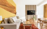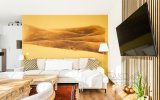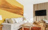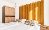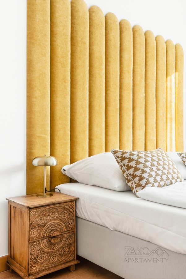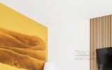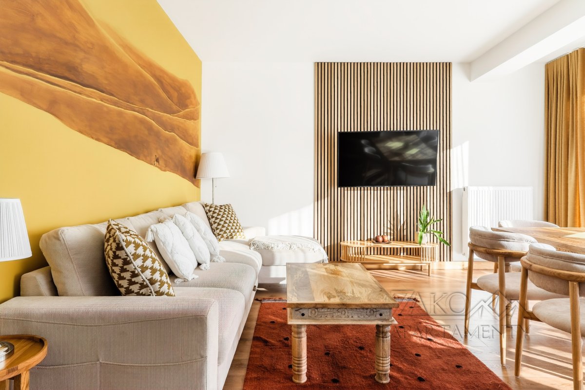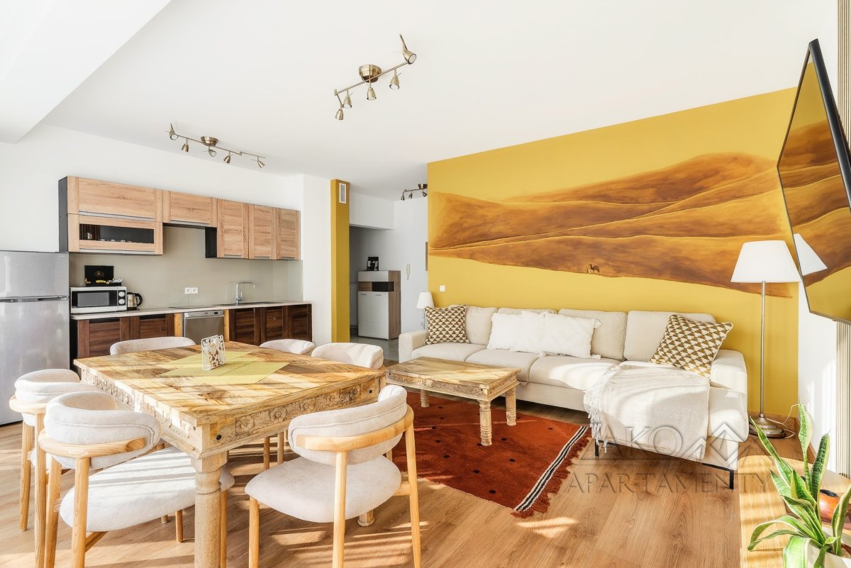 Apartament Camel to elegancka, przestronna przestrzeń, której charakter w pełni oddaje jej nazwa. W salonie uwagę przyciąga artystyczna ściana z motywem pustyni i karawany wielbłądów, subtelnie uzupełniona złotymi dodatkami. Centralnym punktem wnętrza jest duży, stylowy stół, idealny do wspólnych posiłków i spotkań w gronie rodziny lub przyjaciół. Całość tworzy harmonijne, dopracowane wnętrze o wyjątkowej atmosferze.