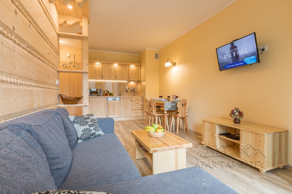 Z dwóch BALKONÓW rozpościera się przepiękny widok na GIEWONT. Stylowo urzadzone drewniane wnętrze pozostawia niepowtarzalne wrażenia po spędzeniu czasu w atmosferze zakopiańskiego stylu. Przestronny apartament daje komfort wypoczynku rodzinie z dziećmi lub grupie zaprzyjaźnionych osób.