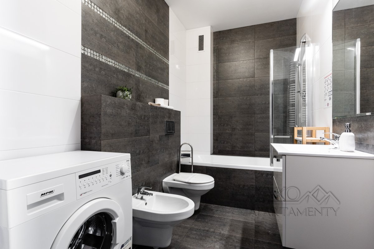 wanna z prysznicem, umywalka, wc, bidet, pralka, ręczniki, suszarka do włosów.