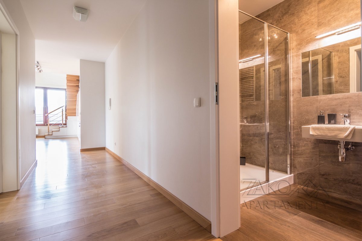 Struktura Poziom I: duży salon z wyjściem na balkon, aneks kuchenny z częścią jadalną, 2 x sypialnia, garderoba, przedpokój, łazienka. Poziom II: przedpokój z częścią wypoczynkową, 2 x sypialnia, łazienka