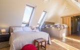 Piętro: łoże małżeńskie (160 cm/200 cm), na podeście materac (160 cm/200 cm), 2x szafka nocna, komoda, wieszak, TV 32', pościel, z okna WIDOK na GÓRY. |