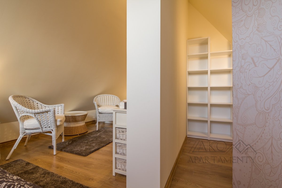 POEZJA to prawdziwa ""poezja"", przestronny dwupoziomowy apartament z trzema sypialniami w centrum Zakopanego, w pełni wyposażony. Jest to idealne miejsce dla rodziny a nawet trzech par. Apartament POEZJA jest pięknie i funkcjonalnie zaprojektowanym wnętrzem  z otaczającymi cytatami wierszy o tematyce Tatrzańskiej znanych poetów. Można tu przyjemnie spędzić wypoczynek w nowoczesnym, stylowym i gustownym wystroju, czując oddech otaczających GÓR. Letnie wieczory można spęzić na dużym BALKONIE. Do dyspozycji gości w apartamencie jest przestronny DUŻY SALON, duży aneks kuchenny z częścią jadalną, trzy sypialnie  z wyjściem na BALKON, przedpokój oraz dwie łazienki.