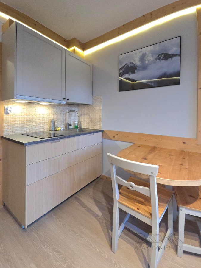 Drewniane obicia ścian nawiązują do popularnego w tym regionie zdobienia wnętrz. Tatrzańskie widoki na fotografiach przypominają o tym, co każdy gość apartamentu znajdzie wychodząc na spacer, zaledwie parę kroków od miejsca pobytu.