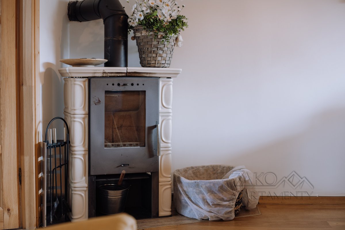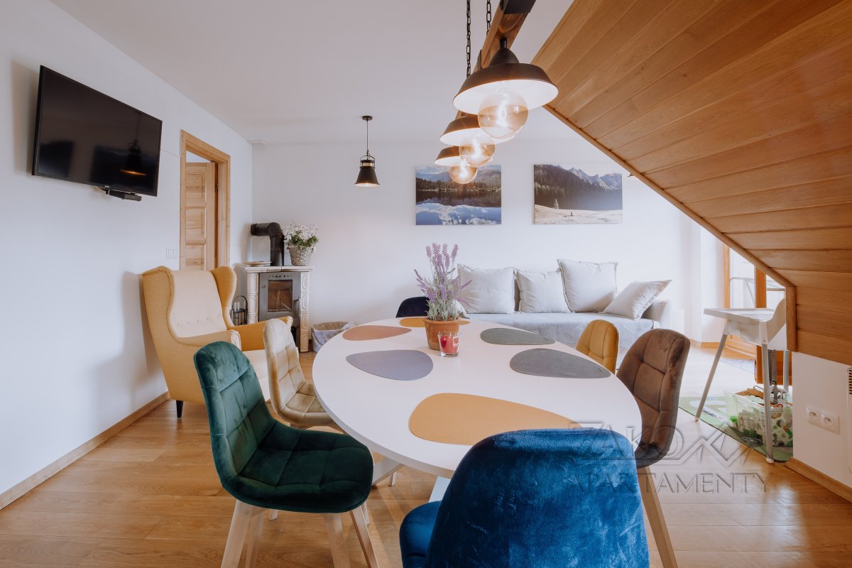 Poziom I : Salon z KOMINKIEM z kącikiem dziecięcym, balkon z pięknym widokiem na Giewont, aneks kuchenny, łazienka, zamykana sypialna.