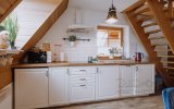 Kuchnia lodówka, płyta elektryczna 3x palnik, zmywarka, toster , czajnik elektryczny, kuchenka mikrofalowa, naczynia, sztućce, szkło, garnki, rozkładany stół biesiadny dla 8 osób z krzesłami.